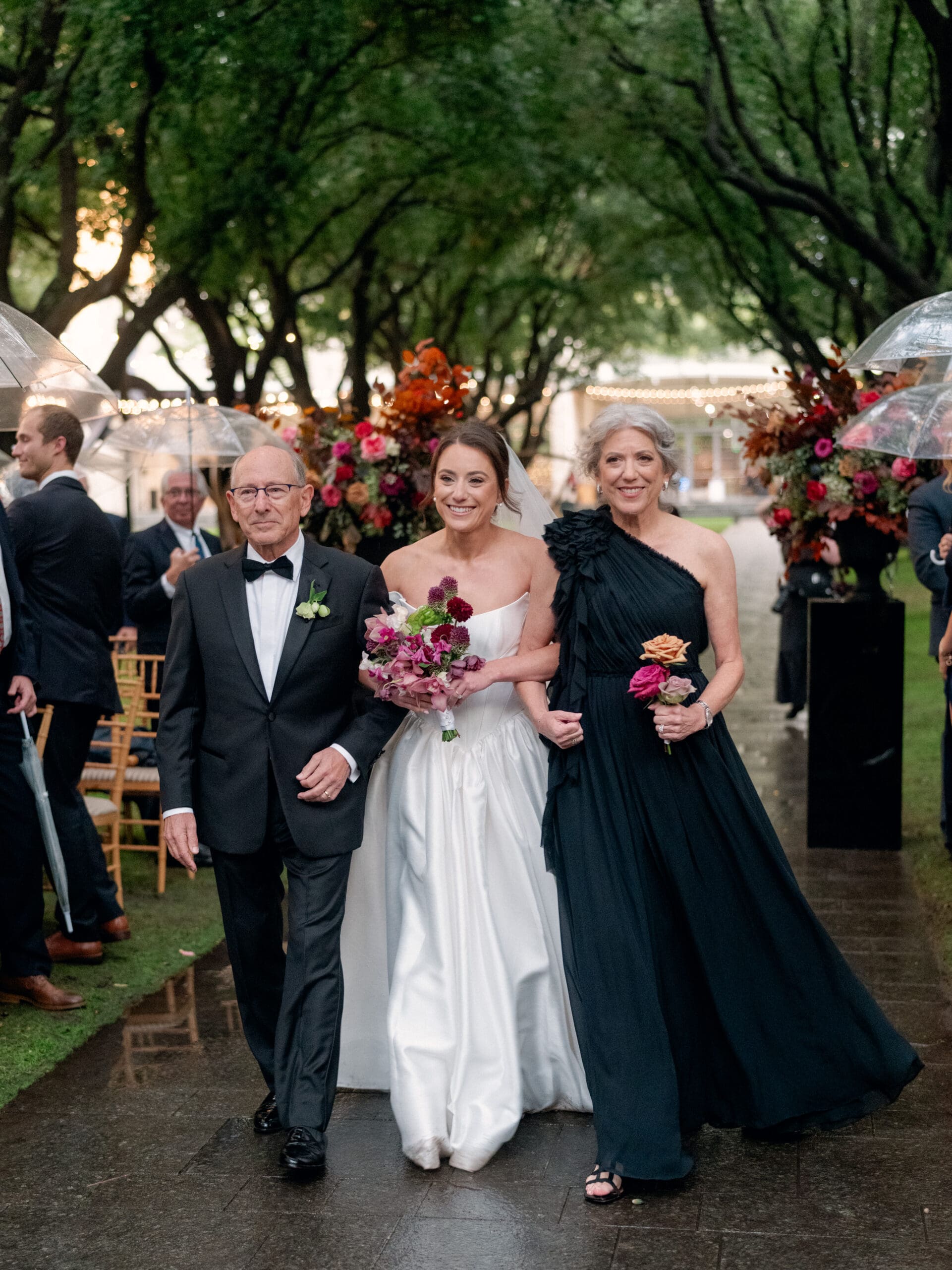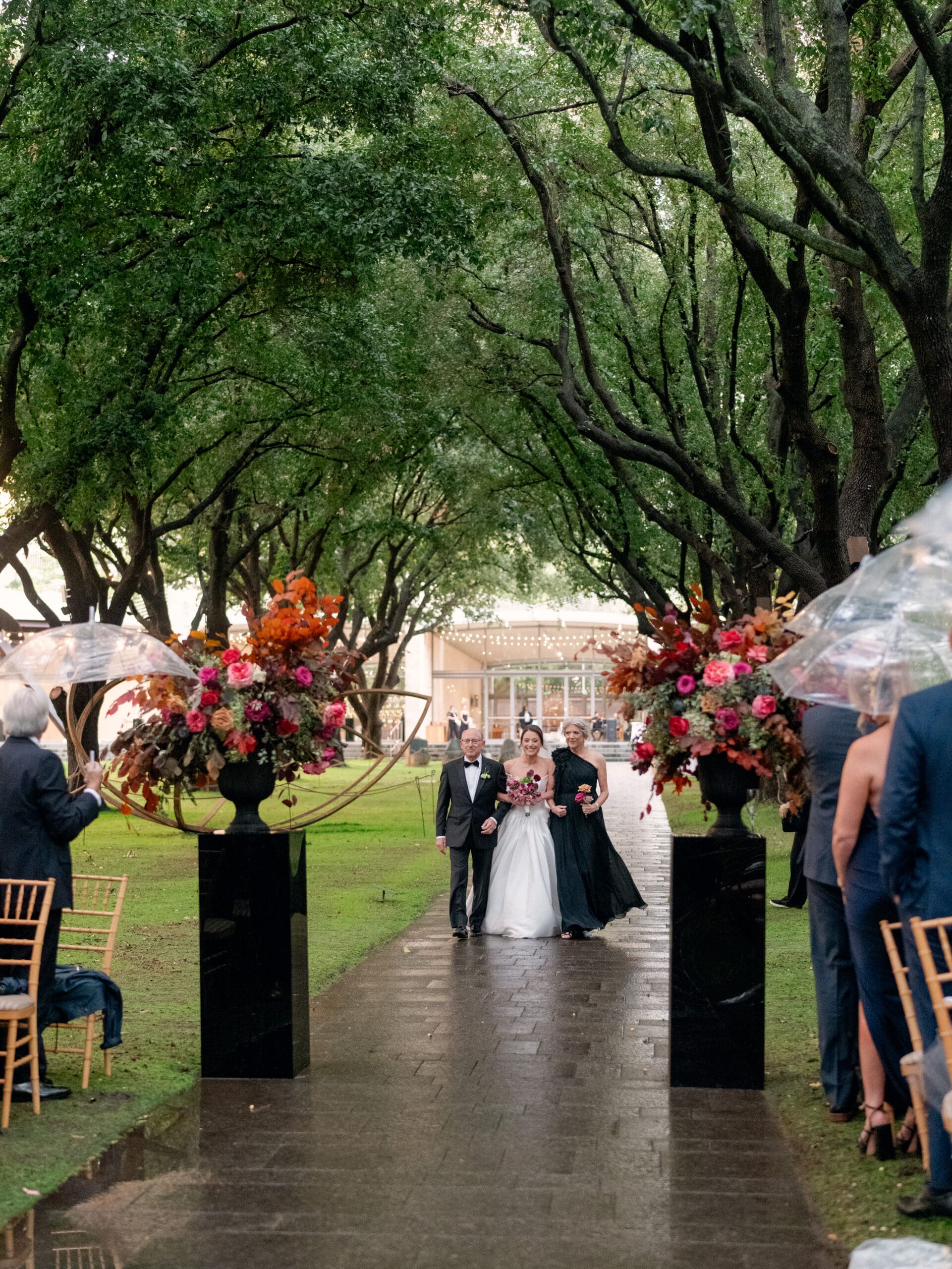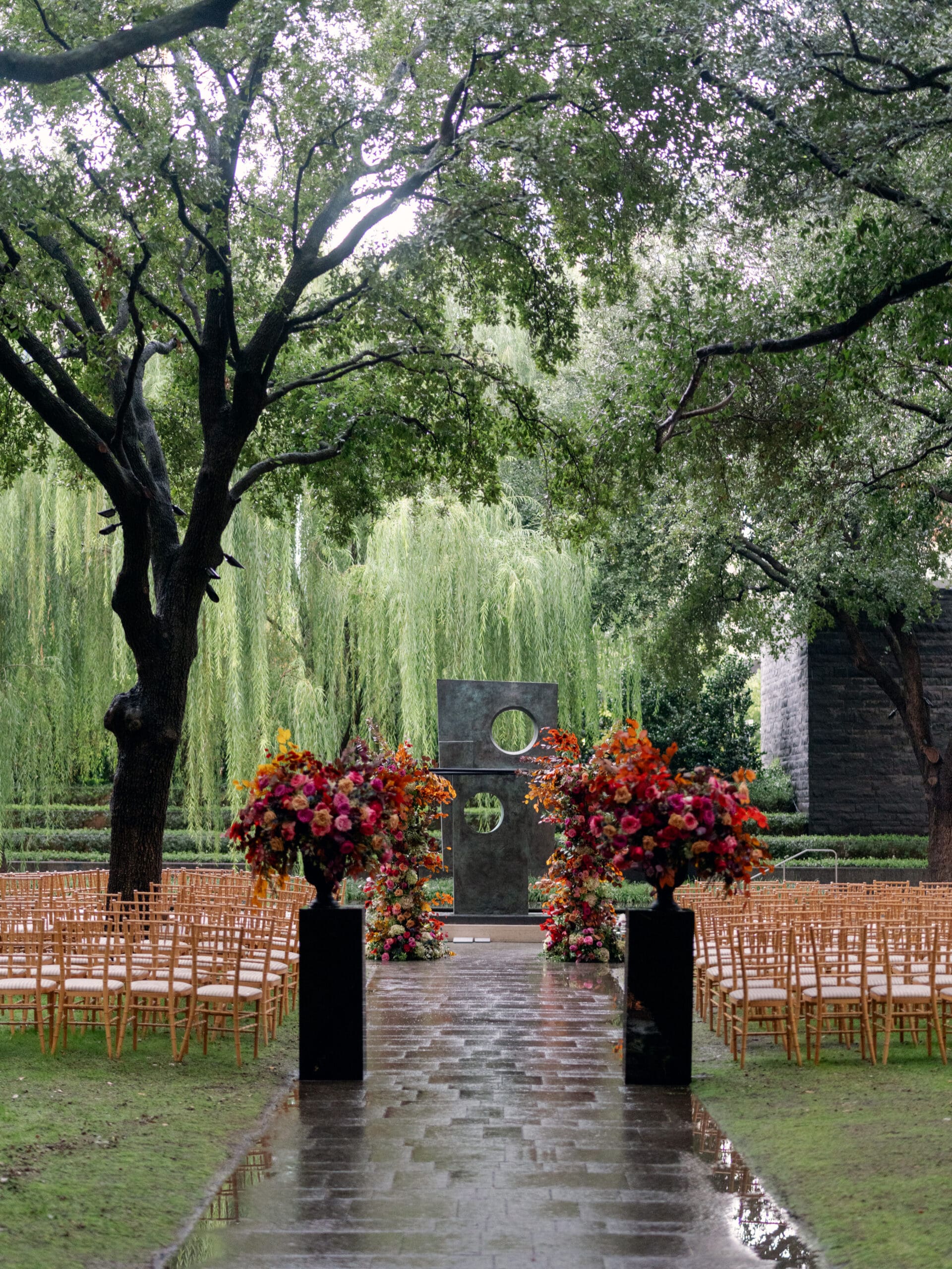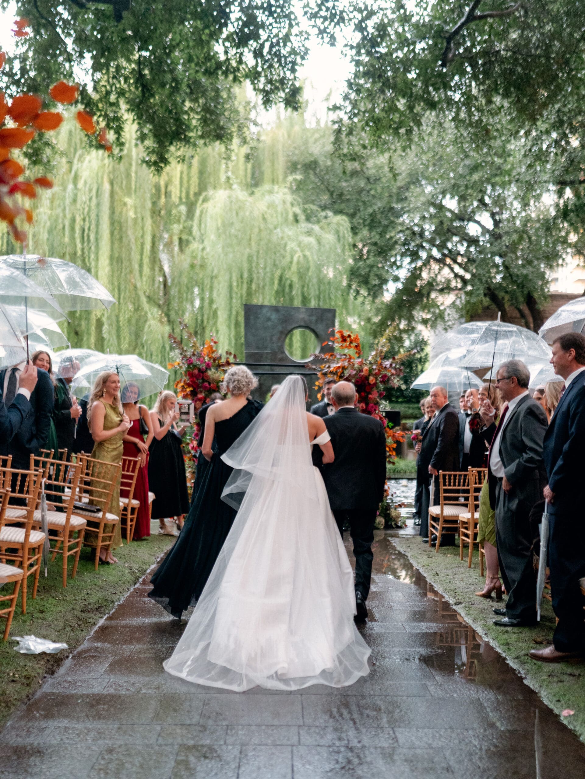 The Nasher Sculpture Garden provided a stunning backdrop for this Dallas wedding, blending contemporary art with lush outdoor spaces. Originally planned as a fully outdoor garden celebration, the day took an unexpected turn when a flood warning hit Dallas. But Sarah had prepared—she’d paid two Etsy witches to keep the rain away, and they sort of came through. A sliver of sunshine appeared just as the ceremony began, allowing Sarah and Brandon to exchange vows outside before moving the reception indoors.