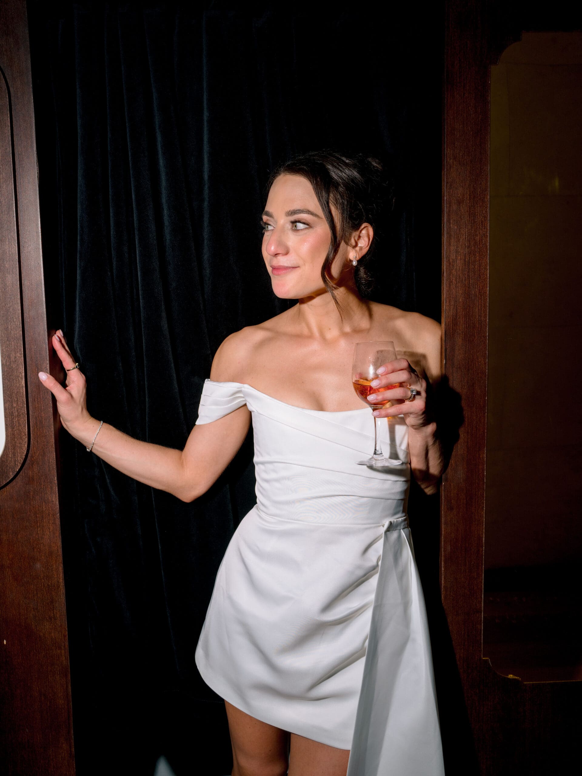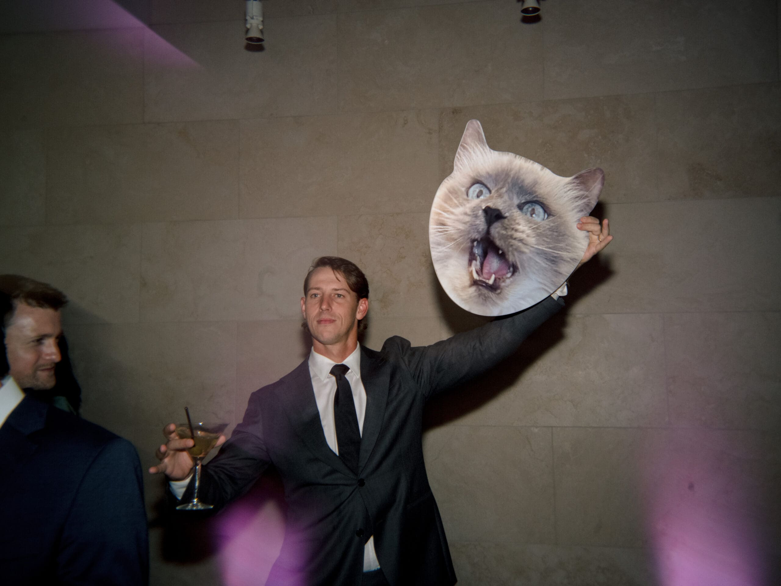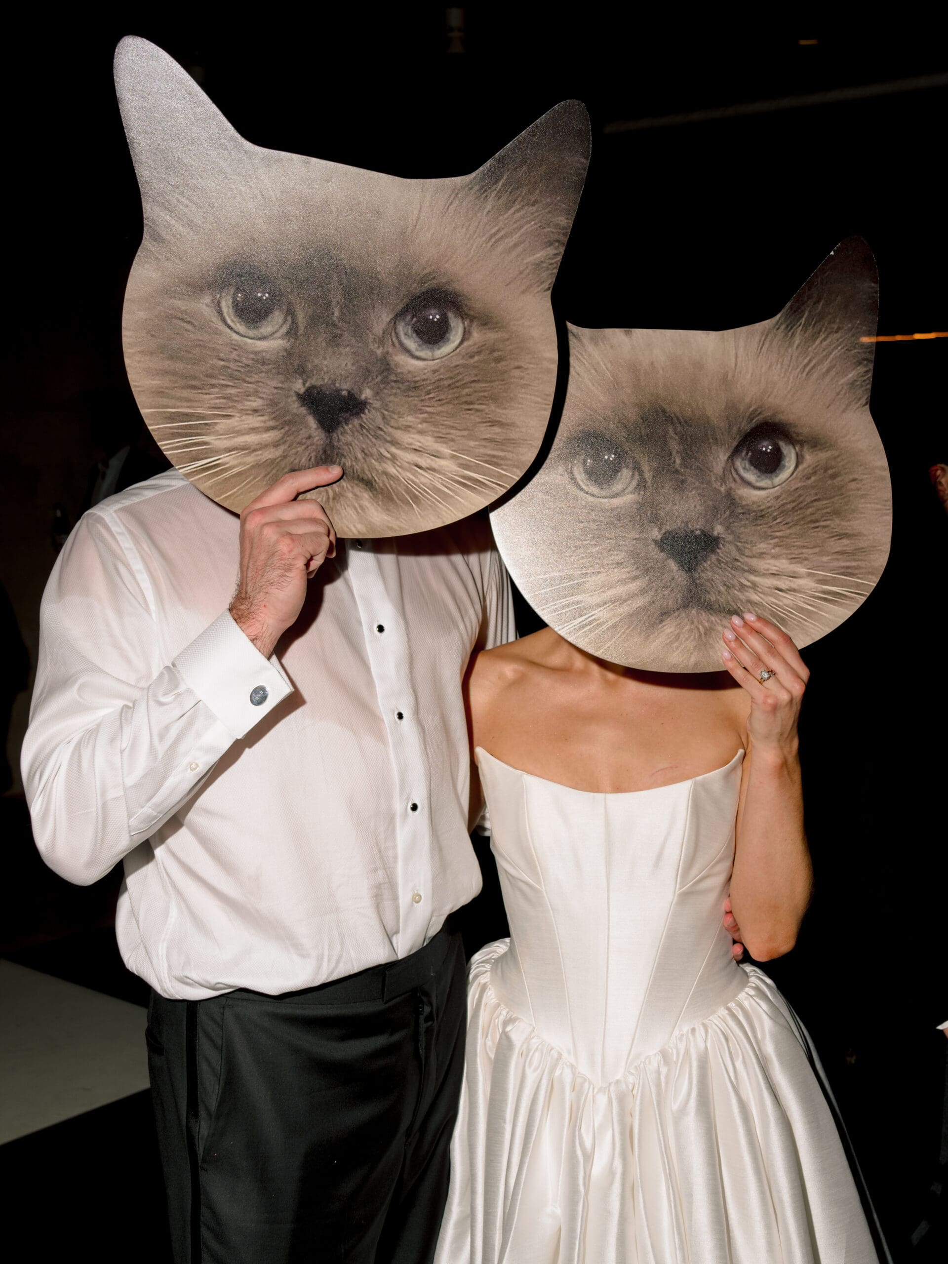 For the couple who wants their wedding to feel like a living reflection of their personality, Sarah and Brandon’s approach is inspiring. They wove Cashew into every corner of the day—larger-than-life cutouts of Cashew’s face became dance floor companions, a custom-designed pattern featuring their cat wrapped the bar, and a tiny figurine perched atop the cake. The moody fall color palette captured the romantic, cozy ambiance they envisioned, while the sculpture garden setting provided an artistic edge.